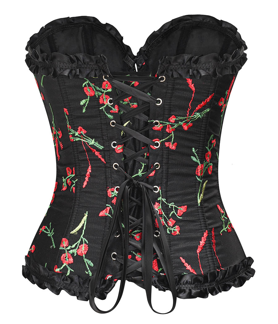 This 2 pieces Cherry Embroidery Boned Corset features front steel busk closure and lace-up back, satin ribbon trimmed eadge and modesty panel, includes a matching G-string.