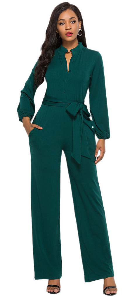This 1 piece Elegant Office Lady Jumpsuit features buttons front closure, waist belt tie details, long sleeves and floor length.