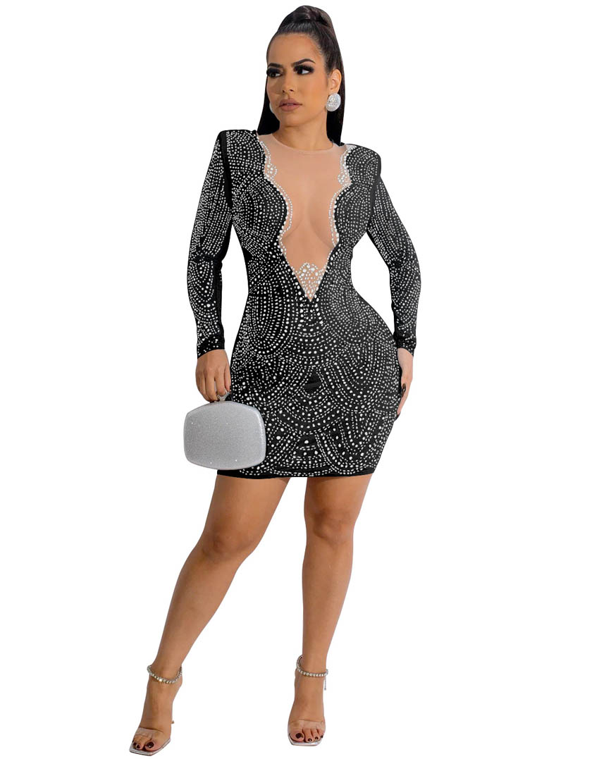 This 1 piece Exclusive Rhinestone Mesh Dress features a long sleeved mini dress with zipper back closure, a nude mesh center front panel and high scoop neckline.