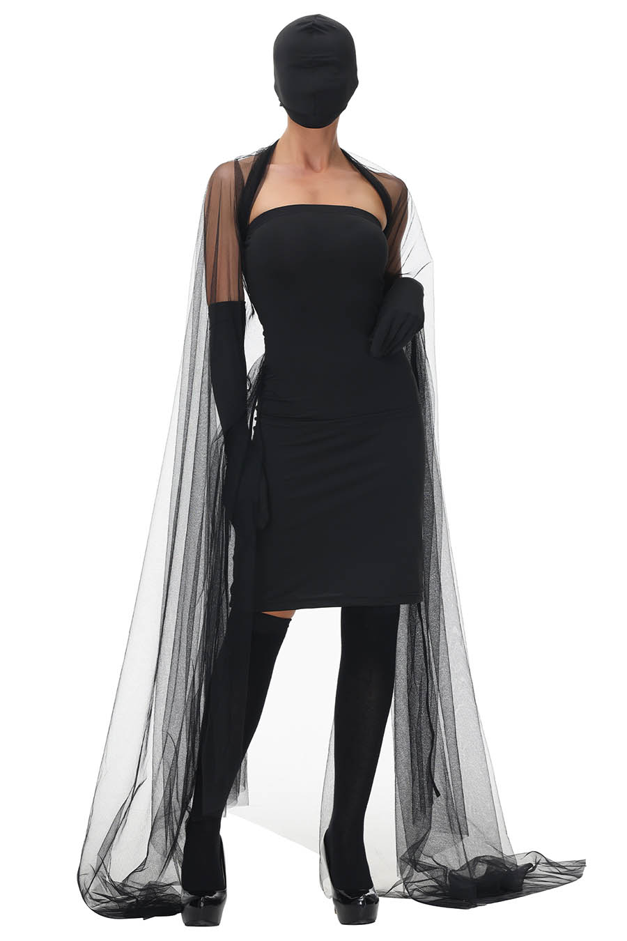 This 5 pieces Fancy Kim Kardashian Halloween Costume includes a black tube mini dress, a full covered face mask, a maxi long mesh shawl, a matching gloves and stockings.