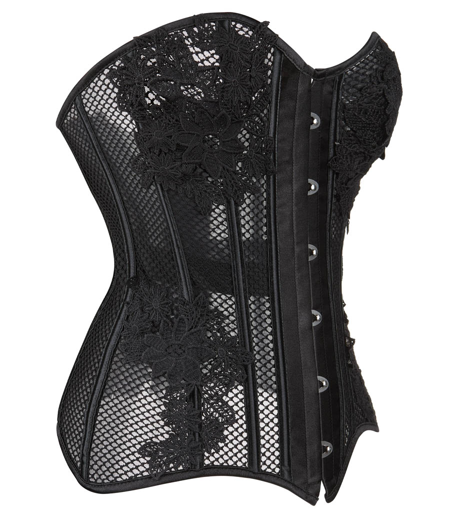 This 2 pieces Floral Lace Embroidery Corset features front metal busk closure, built in waist band, satin center front and lace up back closure.