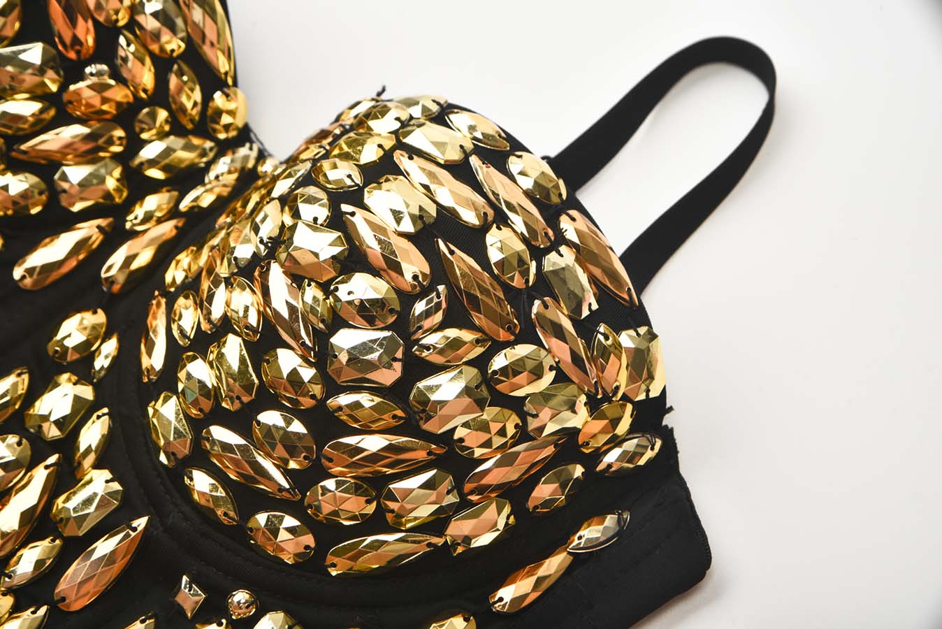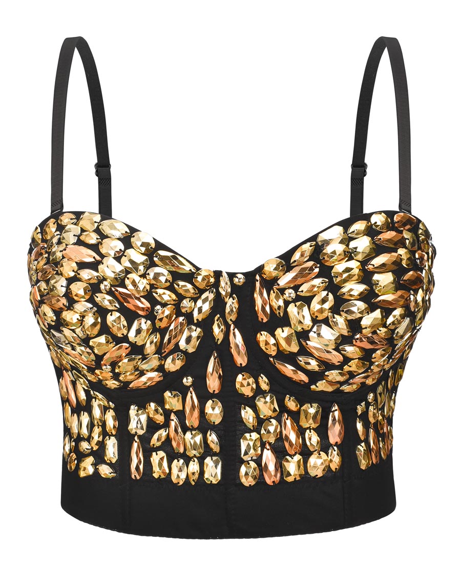 This 1 piece Gold Rhinestone Bustier top features gold rhinestone embellishment, with soft cups for supports and silicone grip band, hook and eye back fastening, adjustable shoulder straps.