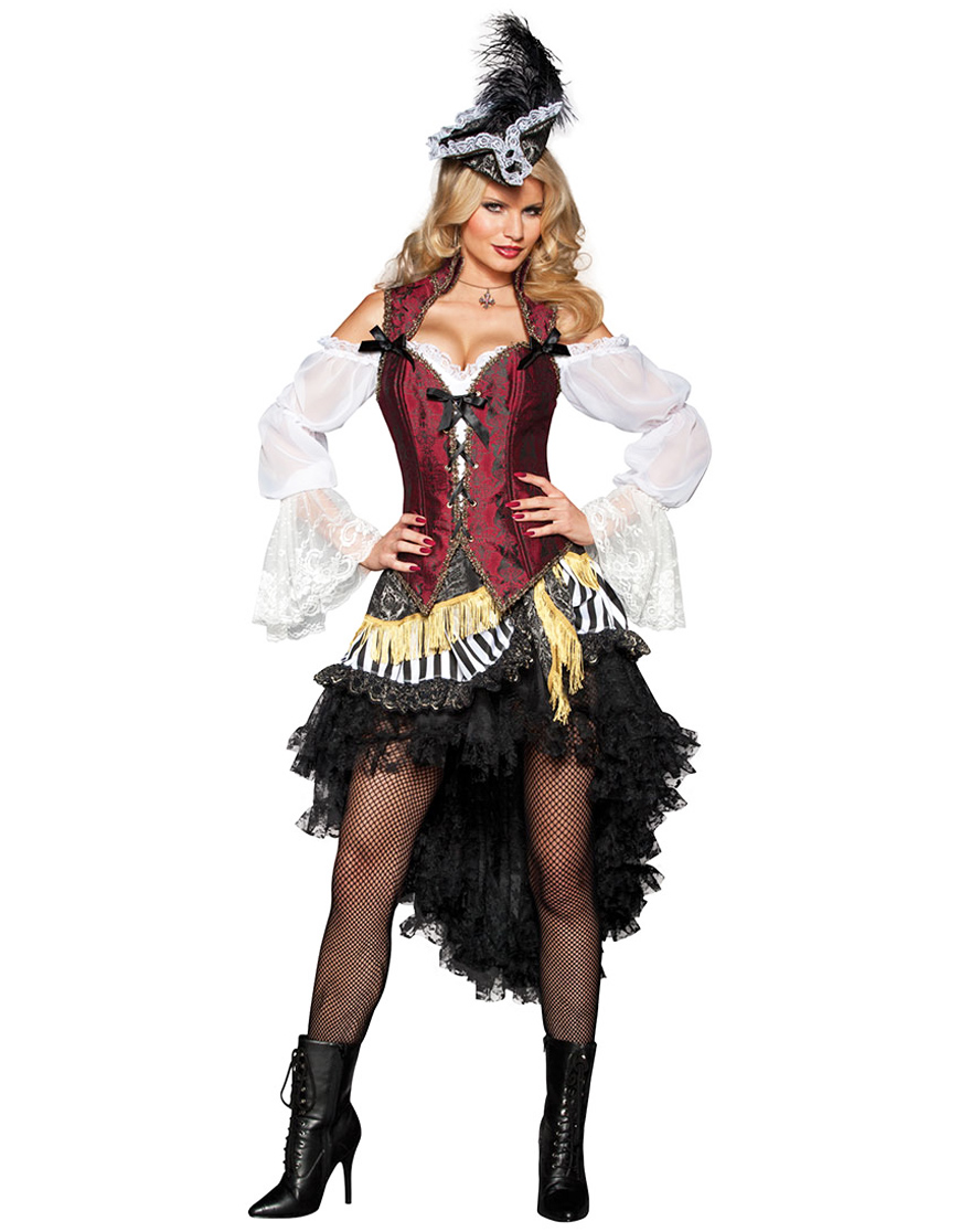 This Super Deluxe High Seas Treasure Costume includes the brocade corseted vest, multi-layered ruffle dress with brocade hip sash, separate multi-layer black lace petticoat, and the mini tri-corn brocade hat with ostrich plume.