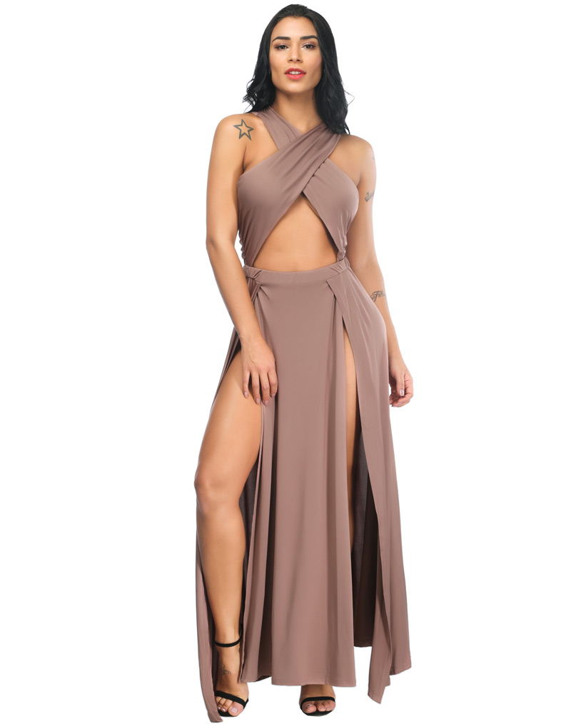 This sexy gown long dress features a high waist with side slits, wrap criss cross front, solid color and sleeveless.