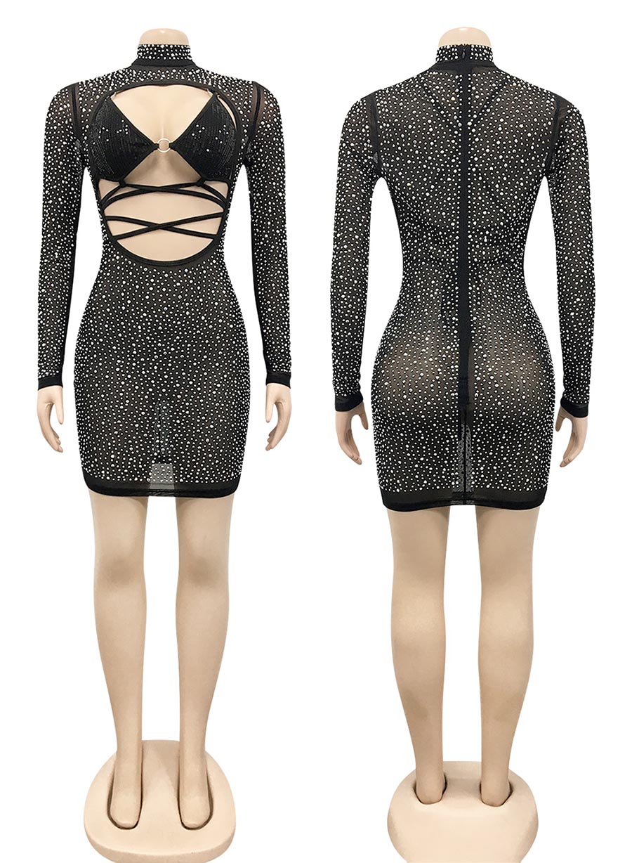 This 2 pieces Bodycon Dress Set includes a sequined bra top, rhinestone mini dress features high round neckline, opening front with strappy details, long sleeves and zipper back closure.