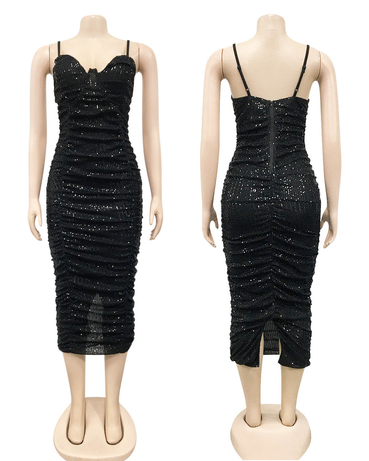 This 1 piece Ruched Sequin Bodycon Midi Dress features a sweetheart neckline, adjustable spaghetti shoulder straps and zipper back closure.