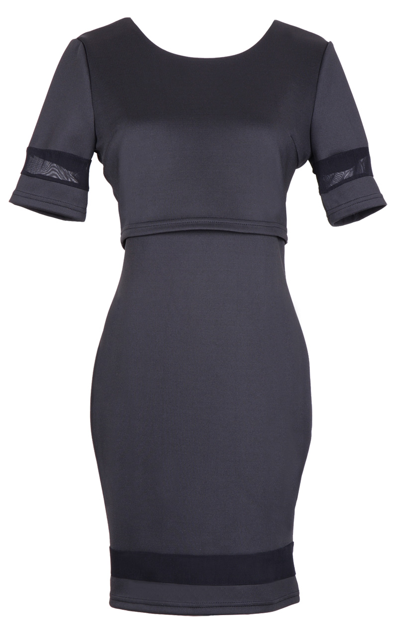 This one-piece bodycon dress features silky-feel, lightly textured stretchy scuba material, round neckline with button closure back, crop-top overlay design, sheer stripe detailing, short sleeves and mini length.