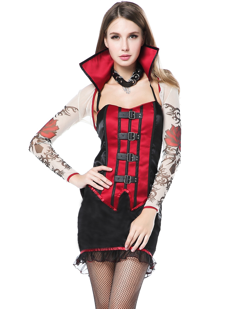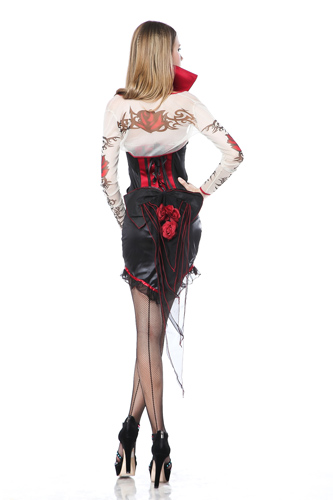 The five-piece, Le Vamp Fatale costume includes a corset styled dress with a back bustle and buckle front detailing, adjustable and removable vampire collar, tattoo printed shrug and PVC choker with chain detailing.